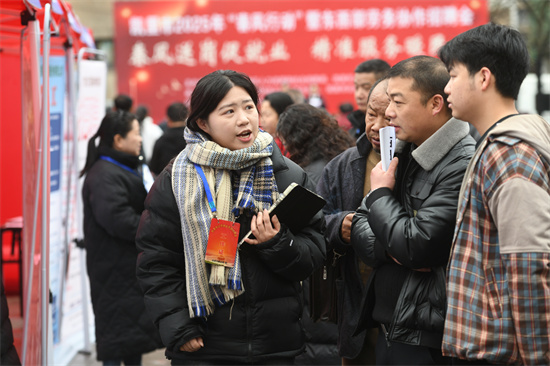 貴州省凱里市洗馬河街道文化社區(qū),一企業(yè)工作人員(右)在“春風(fēng)行動(dòng)”系列招聘會(huì)上介紹招聘情況。(楊仁海 攝)