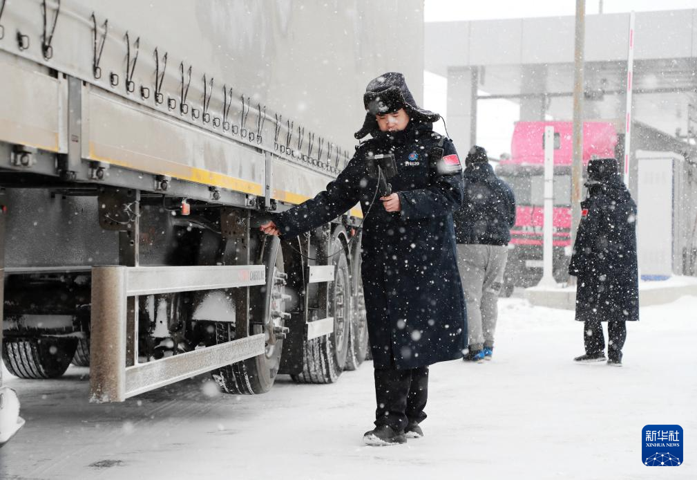3月12日,在黑龍江省黑河公路口岸,黑河出入境邊防檢查站的民警在雪中查驗入境車輛。