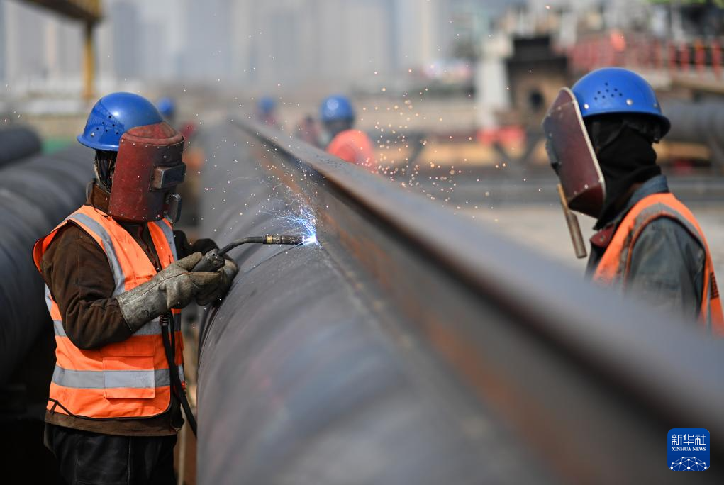 3月13日,工作人員在位于天津市濱海新區(qū)的于新橋施工現(xiàn)場(chǎng)焊接圍堰鋼管樁。