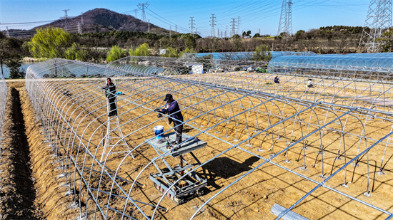2025年3月21日,春和景明,安徽省合肥市廬江縣石頭鎮(zhèn)芮崗村金喬生態(tài)園一片繁忙的建設(shè)場景,10多名村民在基地技術(shù)人員的指導(dǎo)下,正在緊張搭建大棚,豎立鋼管支架、搬運(yùn)物資、平整土地,打造生產(chǎn)無害化、區(qū)域生態(tài)化、環(huán)境優(yōu)美化的果蔬種植生態(tài)園。