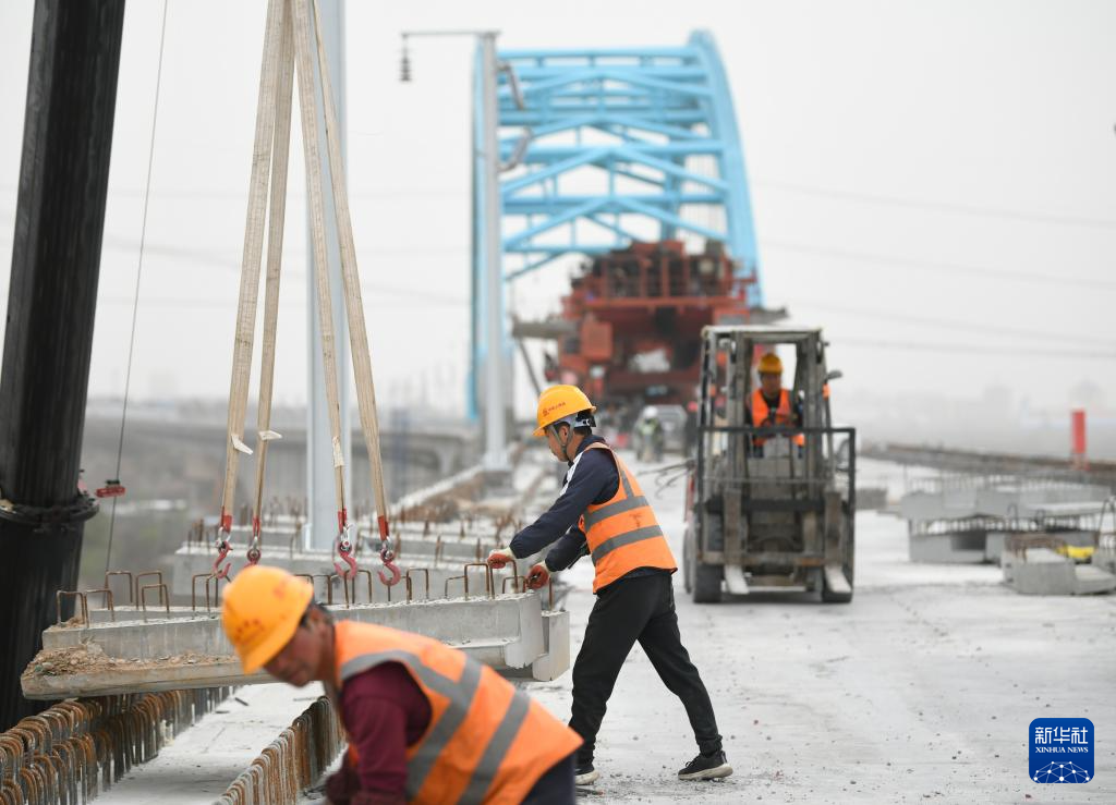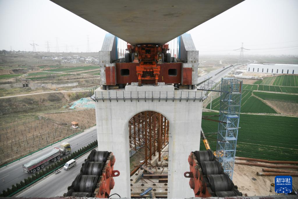 3月26日,中鐵上海局工人在西延高鐵富平特大橋施工。