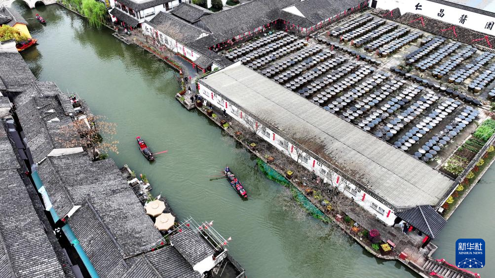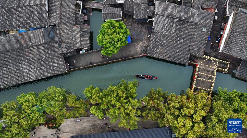 3月29日,烏篷船行駛在安昌古鎮(zhèn)的河道上(無人機(jī)照片)。