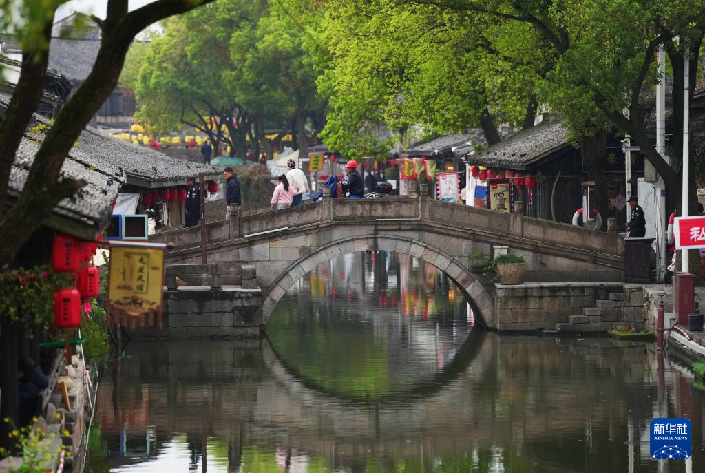 3月29日,人們走在安昌古鎮(zhèn)的石橋上。