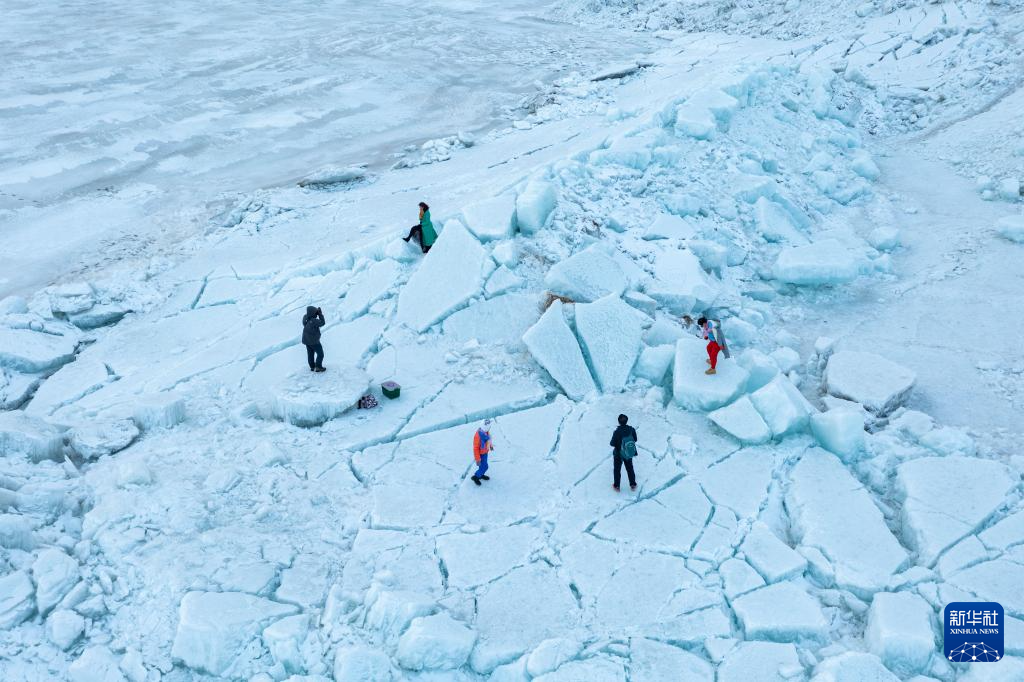 3月31日,游客在興凱湖畔的冰層上游玩(無人機(jī)照片)。