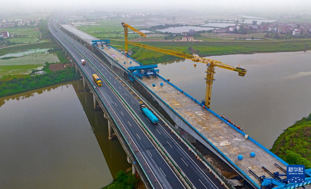 4月27日,江西省樟吉高速改擴建項目新余袁河特大橋全橋完成澆筑合龍(無人機照片)。