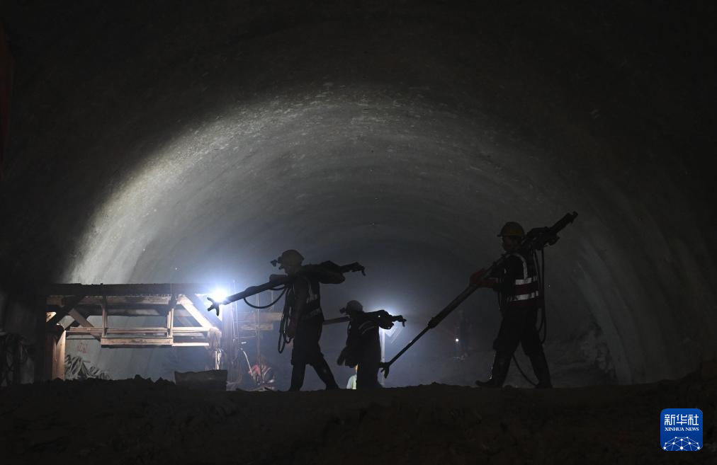 4月28日,在重慶市大足區(qū),工作人員在磨盤山隧道內(nèi)施工。