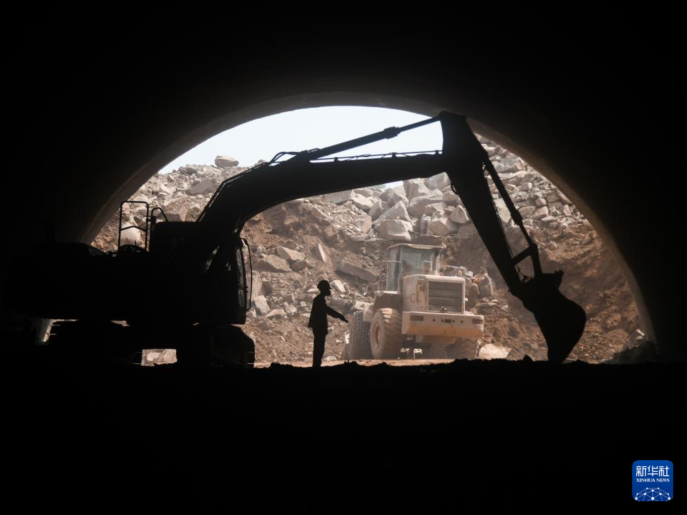 5月2日,中鐵四局的工人在西渝高鐵康渝段劉家壩隧道入口指揮挖掘機(jī)施工。