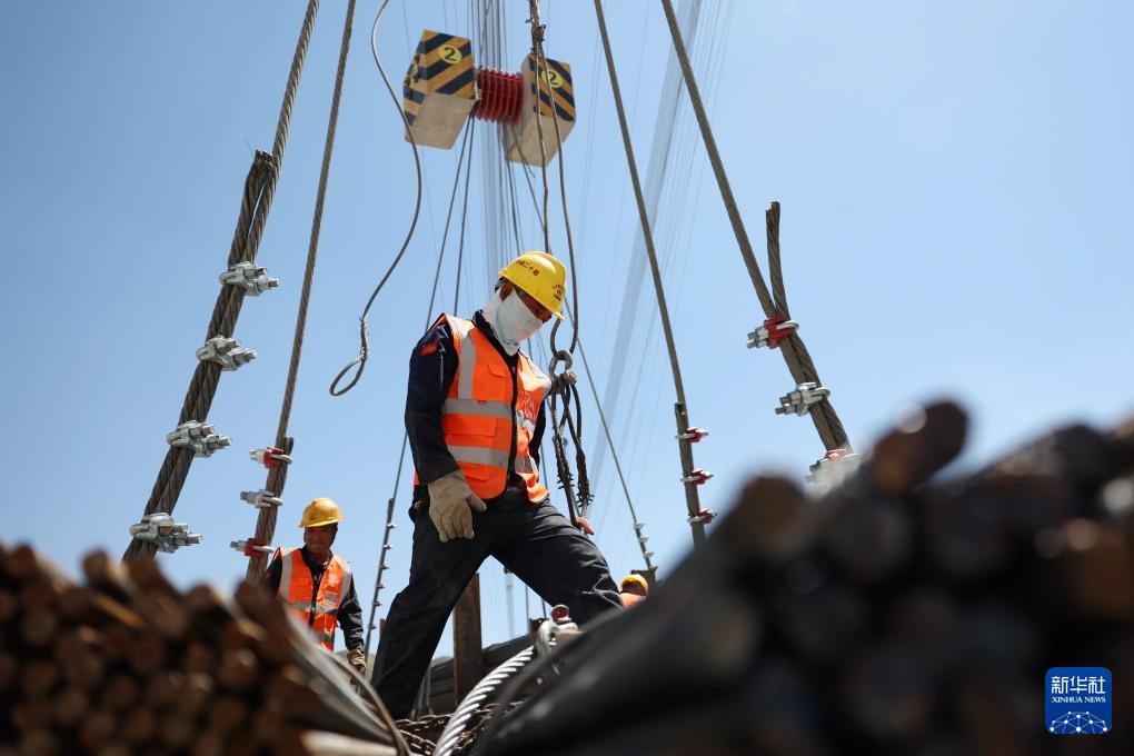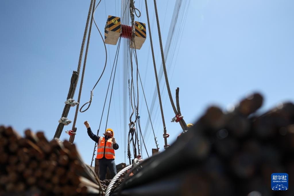 5月10日,中鐵二十局的建設(shè)者在蘭永臨高速公路洮河大橋施工現(xiàn)場進(jìn)行纜索吊裝系統(tǒng)試吊作業(yè)。