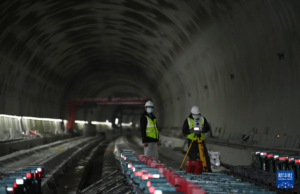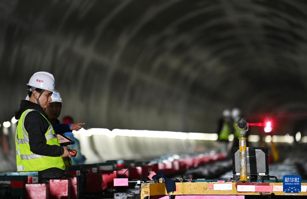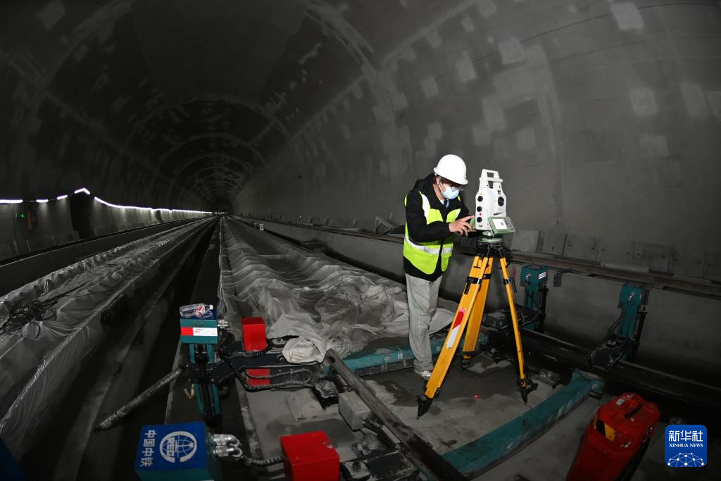 5月13日,在貫通的西康高鐵秦嶺九天山隧道內(nèi),施工技術(shù)人員在無(wú)砟軌道作業(yè)現(xiàn)場(chǎng)采集精調(diào)數(shù)據(jù)。