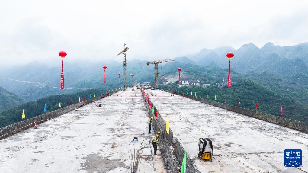 5月15日,工人在納晴高速六枝特大橋上進(jìn)行施工(無人機(jī)照片)。