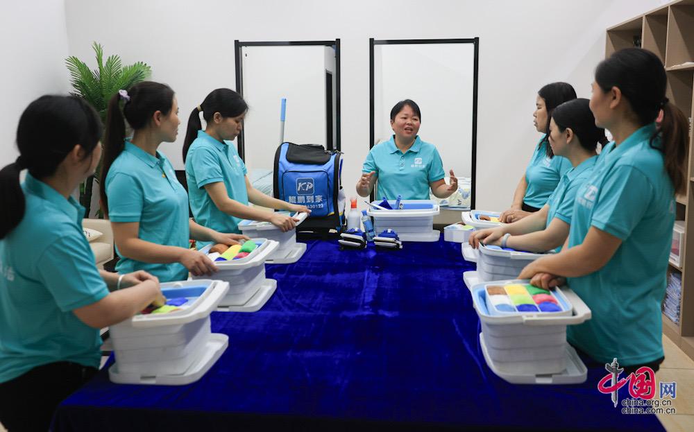 “95后”謝文珍是兩個孩子的媽媽,經(jīng)過培訓(xùn)她掌握了家居保潔、收納整理等基礎(chǔ)家政服務(wù)技能,基本收入也得到了提升。中國網(wǎng)記者 倫曉璇 攝