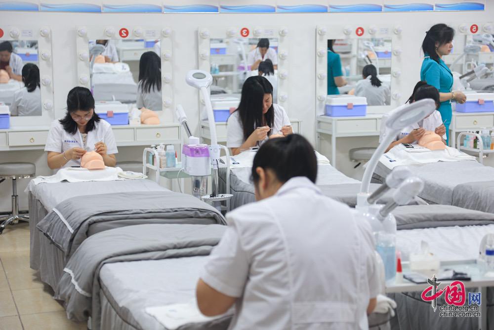 5月12日,在廣東省河源市鯤鵬職業(yè)培訓(xùn)學(xué)校,學(xué)員正在參加美容師培訓(xùn)。中國網(wǎng)記者 倫曉璇 攝