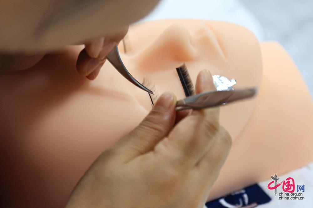 5月12日,在廣東省河源市鯤鵬職業(yè)培訓(xùn)學(xué)校,一名學(xué)員正在學(xué)習(xí)嫁接睫毛。中國網(wǎng)記者 倫曉璇 攝