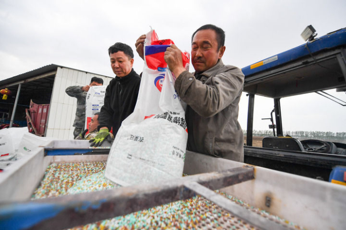 在吉林省公主嶺市陶家屯鎮(zhèn)馬家店村,合鑫種植農(nóng)民專業(yè)合作社農(nóng)民為免耕播種機(jī)加入肥料(2025年5月8日攝)。新華社記者張楠攝
