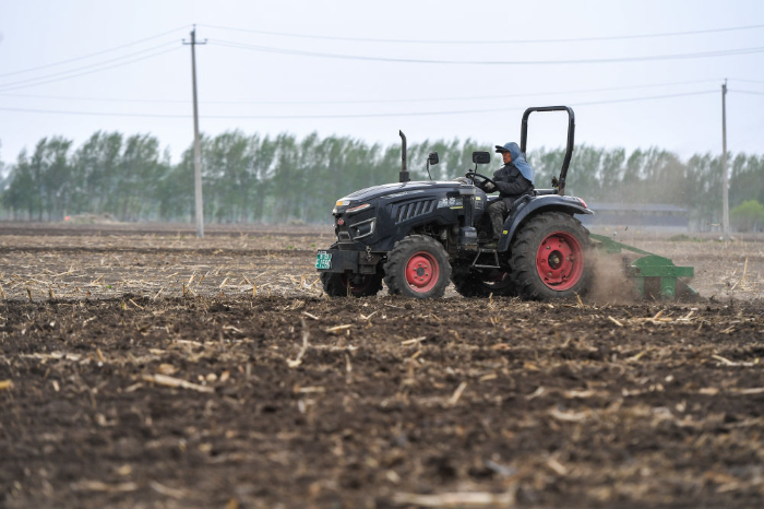 在吉林省公主嶺市陶家屯鎮(zhèn)馬家店村,合鑫種植農(nóng)民專業(yè)合作社農(nóng)民駕駛旋耕機(jī)為播種做準(zhǔn)備(2025年5月8日攝)。新華社記者張楠攝