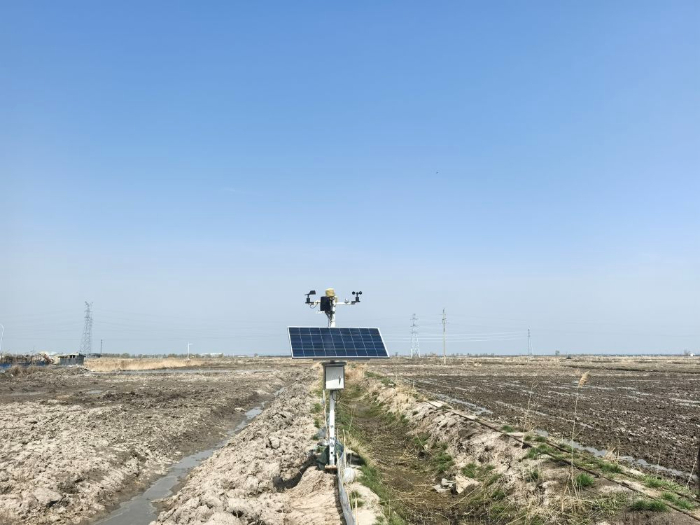 在吉林省松原市前郭爾羅斯蒙古族自治縣的雙子生態(tài)農(nóng)業(yè)開發(fā)有限公司,用于分析溫濕度、土壤肥力、風(fēng)速等信息的智慧設(shè)備矗立田間(2025年4月23日攝)。新華社記者孫鵬程攝