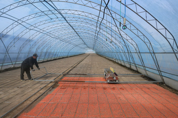 在吉林省吉林市永吉縣岔路河鎮(zhèn)團(tuán)結(jié)村,永吉縣鑫豐種植農(nóng)民專業(yè)合作社農(nóng)民操作農(nóng)機(jī)進(jìn)行水稻育苗工作(2025年4月8日攝)。新華社記者張楠攝