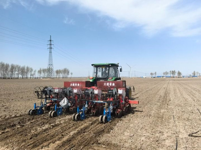 在吉林省松原市乾安縣大遐畜牧場(chǎng),播種機(jī)在黑土地上播種(2025年4月23日攝)。新華社記者孫鵬程攝