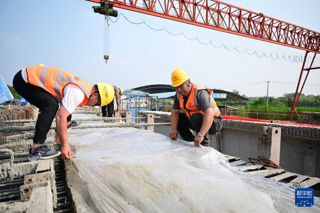 5月26日,工人在銅陵江北港鐵路專用線T梁預(yù)制施工現(xiàn)場作業(yè)。