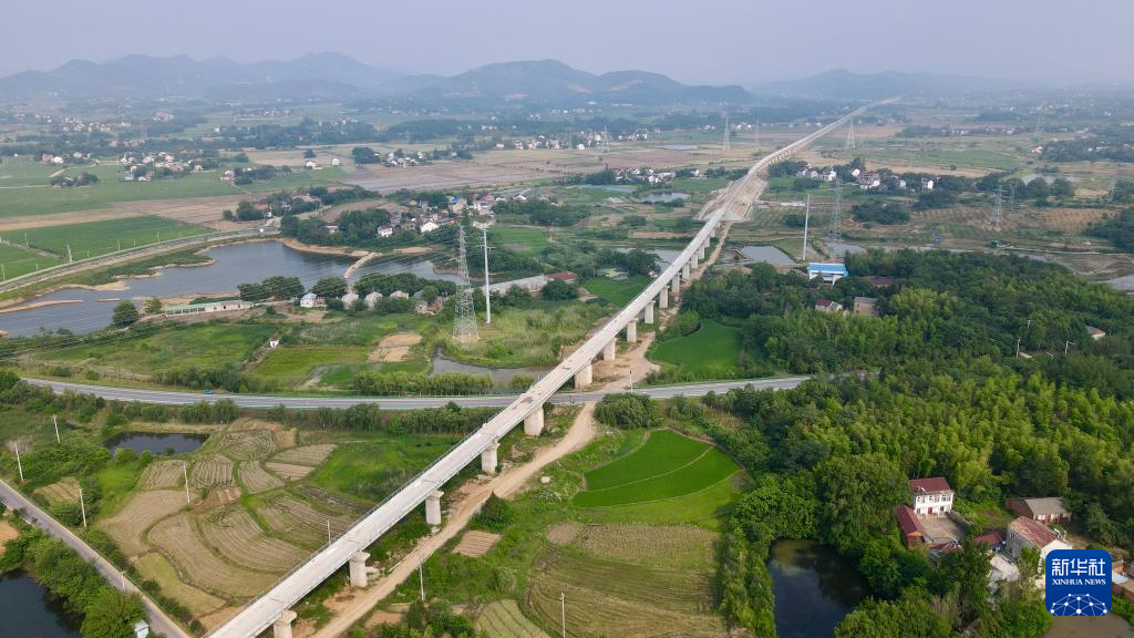 建設(shè)中的銅陵江北港鐵路專用線(5月26日攝,無人機(jī)照片)。