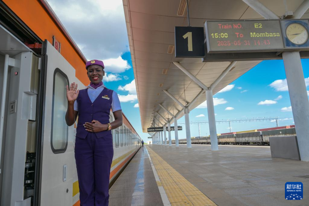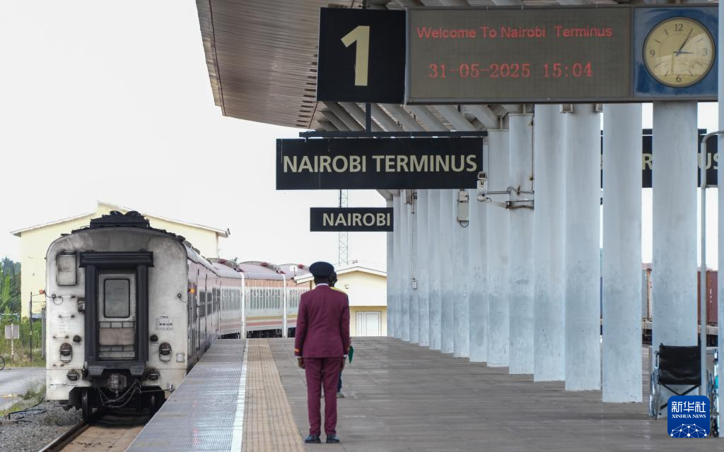 5月31日,在蒙內(nèi)鐵路內(nèi)羅畢站,一名乘務(wù)員在即將開(kāi)往蒙巴薩的E2次列車(chē)旁等候乘客。