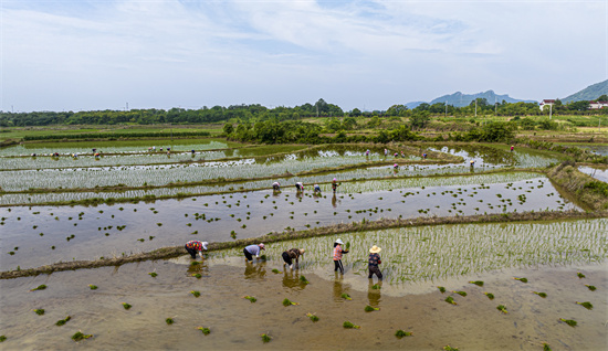 2025年6月4日,芒種時節(jié),位于安徽省合肥市廬江縣樂橋鎮(zhèn)詹店村的阮義才家庭農(nóng)場抓住晴好農(nóng)事有利天氣,正忙著組織村民在農(nóng)機難以作業(yè)的200畝高塝水田里人工栽插一季稻秧苗。