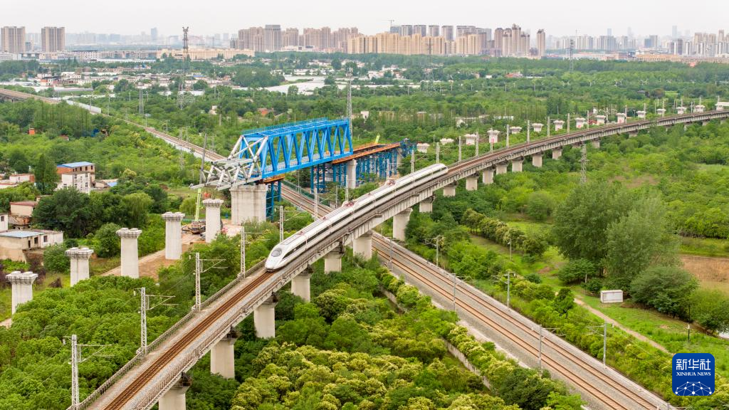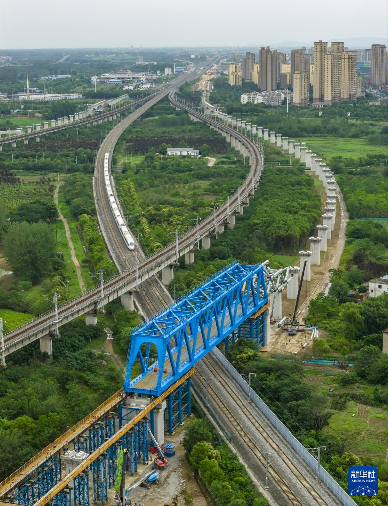 新建滬寧合高鐵鋼桁梁跨越滬蓉鐵路(6月15日攝,無人機(jī)照片)。
