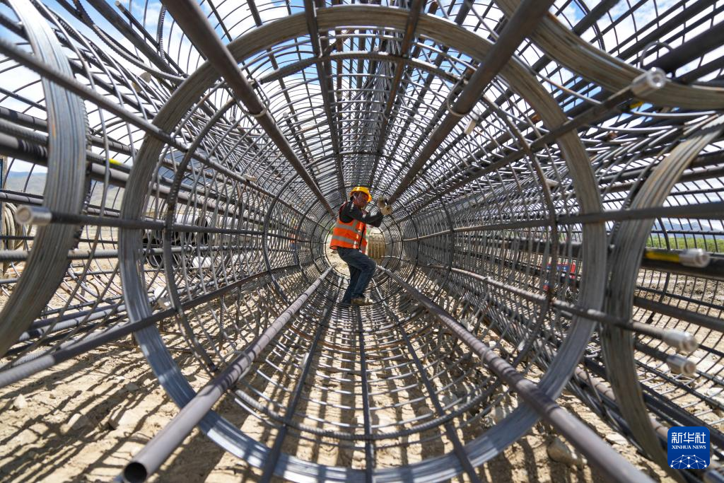 工人在薩熱路跨江大橋建設(shè)現(xiàn)場(chǎng)綁扎聲測(cè)管(6月18日攝)。