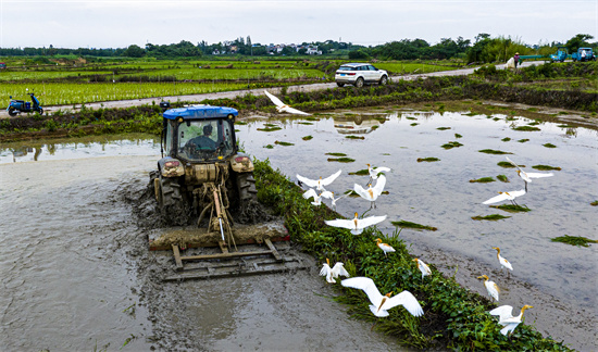 2025年6月22日,在位于安徽省合肥市廬江縣冶父山鎮(zhèn)鋪崗村下陷沖村民組的安權(quán)家庭農(nóng)場(chǎng),農(nóng)機(jī)手正駕駛旋耕機(jī)翻耕農(nóng)田,數(shù)百只白鷺圍繞機(jī)械追逐覓食,勾勒出一派和諧的夏日生態(tài)田園風(fēng)光圖。