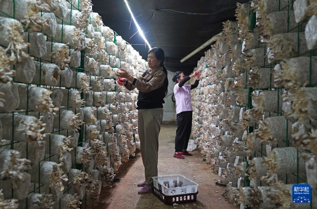 6月26日,在江西省南昌市紅谷灘區(qū)流湖鎮(zhèn)的一家食用菌生產(chǎn)基地,村民在采摘秀珍菇。