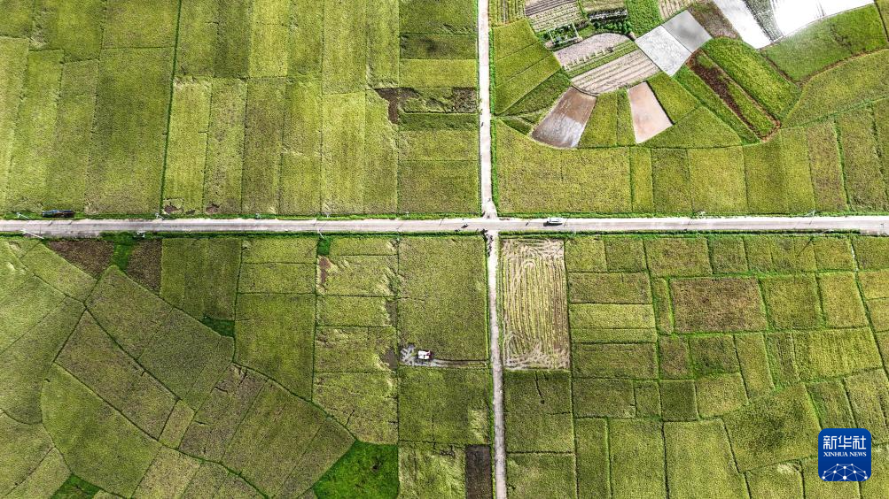 這是7月2日拍攝的廣西欽州市康熙嶺鎮(zhèn)的早稻田(無(wú)人機(jī)照片)。