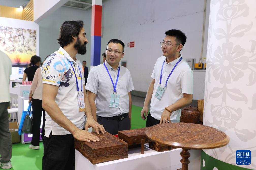 7月6日,一名巴基斯坦客商在蘭洽會上向參會嘉賓推介商品。