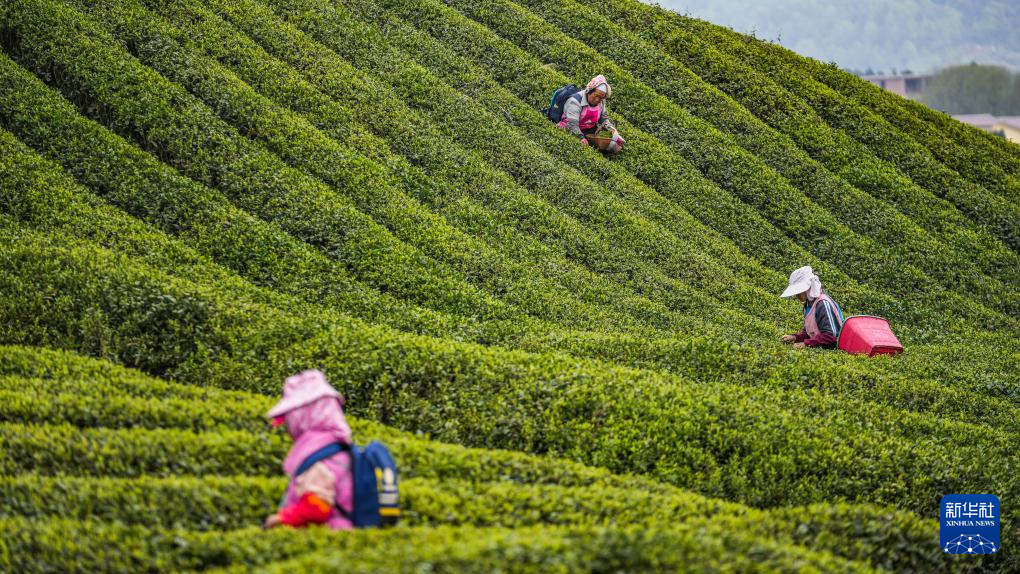 茶農(nóng)在貴州省安順市西秀區(qū)雙堡鎮(zhèn)山京茶場(chǎng)采茶(2025年4月4日攝,無人機(jī)照片)。