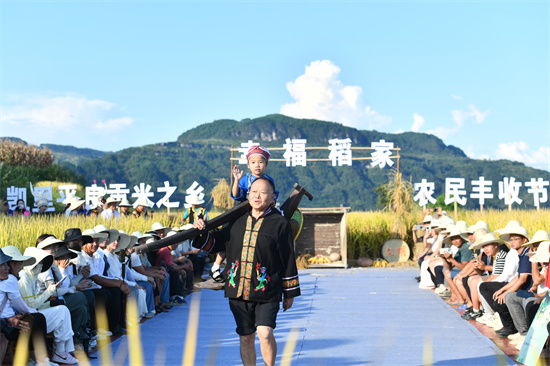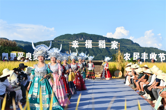 2025年8月28日,貴州省黔東南苗族侗族自治州凱里市2025年凱里平良貢米豐收節(jié)舉行。當天,在該市大風洞鎮(zhèn)都蓬村的稻田中央搭建T臺,邀請貴州村T及當?shù)毓脣寕兩涎菝褡鍟r裝秀與農特產品結合,創(chuàng)新推進“農文旅”深度融合發(fā)展,為鄉(xiāng)村振興注入新動能。