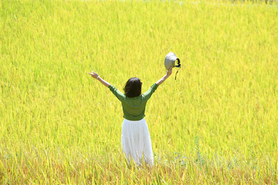 8月28日,貴州省凱里市大風洞鎮(zhèn)都蓬村,一游客在感受水稻豐收的喜悅。(楊仁海 攝)