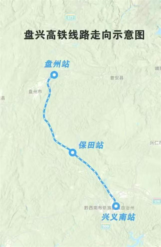 盤興高鐵自滬昆高鐵盤州站引出,經(jīng)貴州省六盤水市盤州市石橋鎮(zhèn)、響水鎮(zhèn)、保田鎮(zhèn),進(jìn)入黔西南布依族苗族自治州興義市清水河鎮(zhèn),終至興義南站。全線新建保田、興義南2座車站以及平菁線路所1座,改建盤州站1座車站。