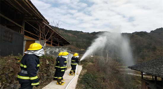涼傘鎮(zhèn)與青溪鎮(zhèn)輔警在美巖村共同開展邊界團寨消防演習    楊海林攝