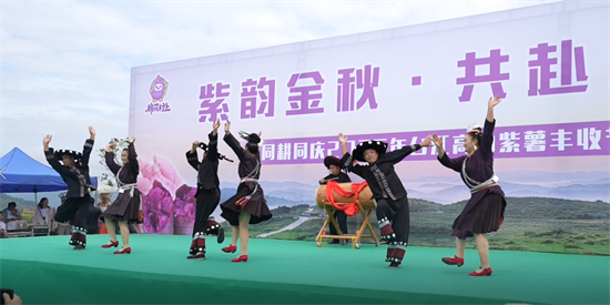 豐收節(jié)現(xiàn)場,氛圍熱烈而喜慶。憨態(tài)可掬的“紫薯寶寶”人偶迎賓、熱情洋溢的苗族攔門酒儀式,迅速拉近了游客與苗鄉(xiāng)的距離。粗獷豪放的《反排木鼓舞》跳出了豐收的喜悅,悠揚(yáng)的歌聲傳遞著貴州的熱情。挖紫薯比賽環(huán)節(jié)更是將活動(dòng)推向高潮,參賽者們體驗(yàn)著田園勞作的樂趣,感受著收獲的滿足。