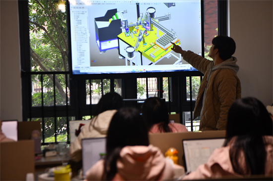 “今年國(guó)慶回遵義老家,跟父母說(shuō)我能設(shè)計(jì)機(jī)器了,他們特別開(kāi)心!”學(xué)生代表鄭珊珊分享道,基地采用“上午上課+下午實(shí)操”模式,半個(gè)月就能獨(dú)立完成零件軟件繪圖、選型、設(shè)計(jì)和出工程圖,師傅逐一檢查指導(dǎo),從轉(zhuǎn)盤式整機(jī)設(shè)計(jì)到流線式整機(jī)設(shè)計(jì),自己的實(shí)戰(zhàn)能力提升特別快。