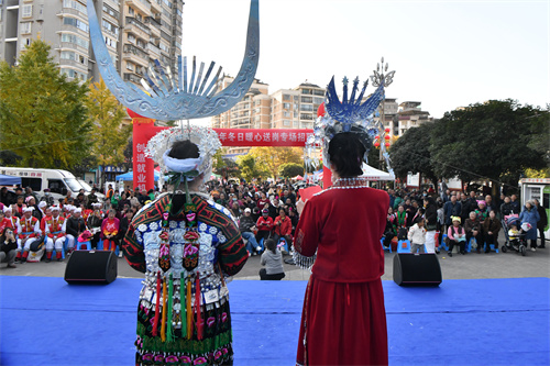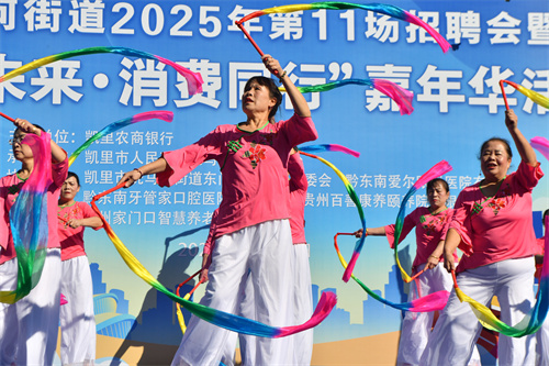 11月21日,貴州省凱里市 洗馬河街道法治廣場,一社區(qū)文藝隊在招聘會助演