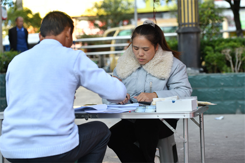 11月21日,貴州省凱里市洗馬河街道法治廣場,一農民在“甘蔗工”攤位登記報名。(楊仁海 攝)