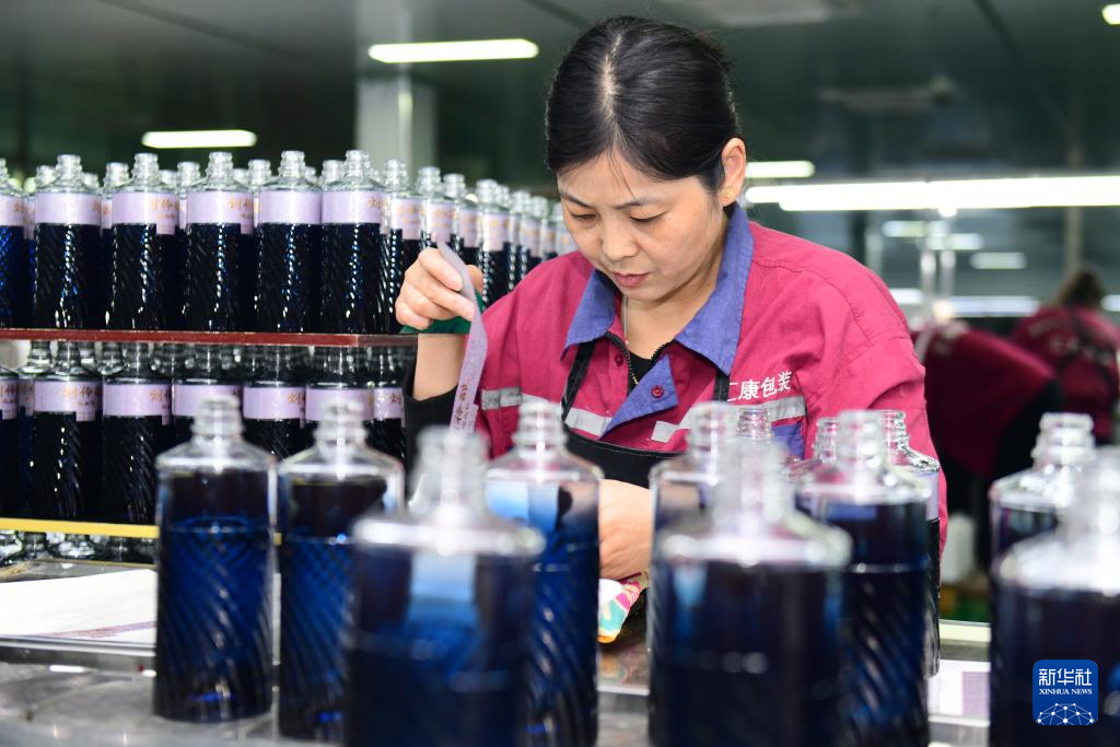 11月27日,在鄆城縣丁里長(zhǎng)街道煙鄆科技產(chǎn)業(yè)園,工作人員為酒瓶貼花。