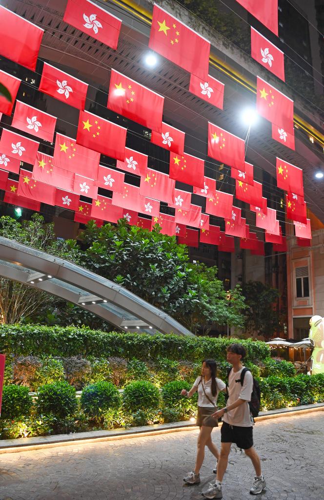 7月1日,行人從懸掛著五星紅旗與特區(qū)區(qū)旗的香港利東街走過。新華社記者 陳鐸 攝