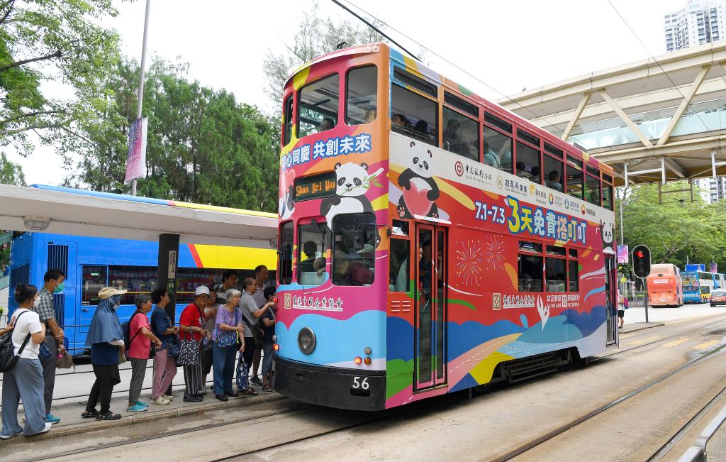 7月1日,人們?cè)谙愀劢诸^排隊(duì)搭乘一輛涂裝“3天免費(fèi)搭叮叮”宣傳海報(bào)的電車。新華社記者 陳鐸 攝
