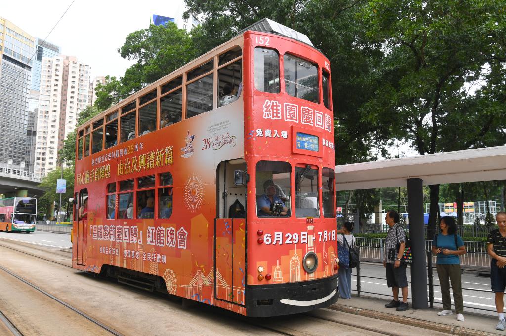 7月1日,一輛涂裝慶祝香港回歸祖國(guó)28周年海報(bào)的電車從香港街頭駛過。新華社記者 陳鐸 攝