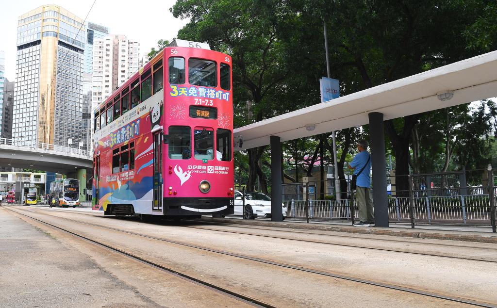 7月1日,一輛涂裝“3天免費(fèi)搭叮叮”宣傳海報(bào)的電車從香港街頭駛過。新華社記者 陳鐸 攝