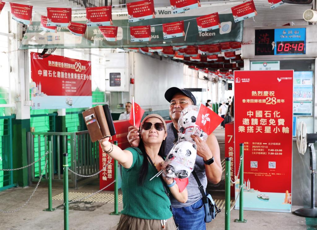7月1日,在香港天星小輪尖沙咀碼頭,市民在中國(guó)石化推出的“慶祝香港回歸祖國(guó)28周年免費(fèi)乘坐日”主題活動(dòng)中留影。新華社發(fā)