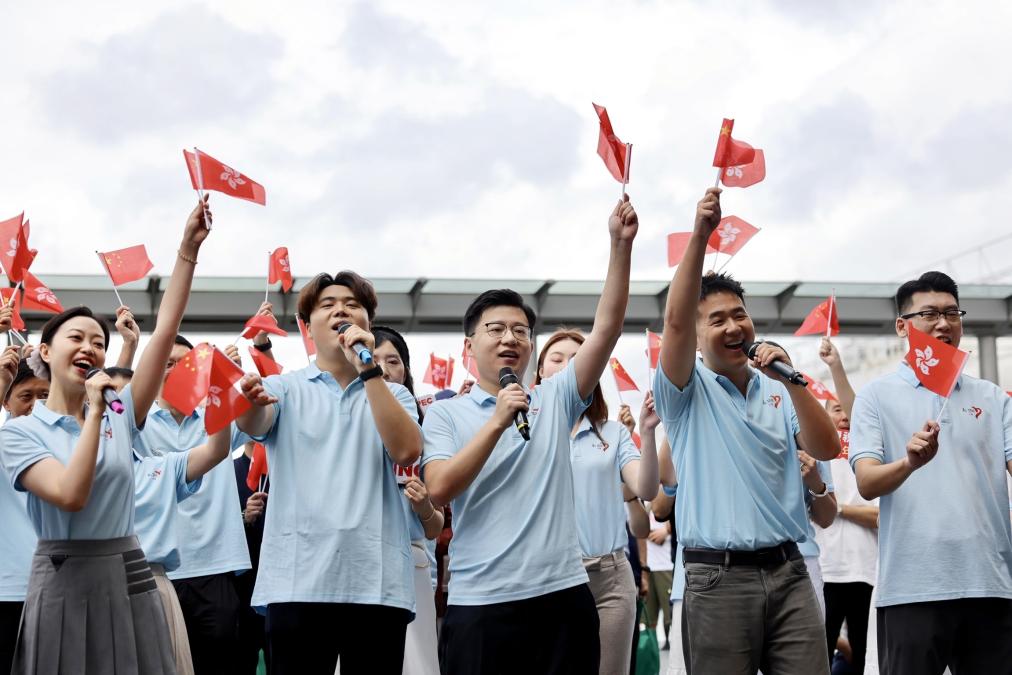 在尖沙咀碼頭廣場(chǎng),一場(chǎng)愛國(guó)歌曲快閃合唱吸引眾多市民聆聽。“小河彎彎向南流,流到香江去看一看……”當(dāng)《東方之珠》《愛我中華》等人們耳熟能詳?shù)母枨懫穑S多人一起跟隨哼唱鼓掌。