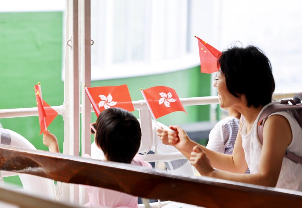 當(dāng)天一早,維多利亞港涌動(dòng)著喜慶氣氛。海濱長(zhǎng)廊游人如織,不少市民手持國(guó)旗與特區(qū)區(qū)旗,在海風(fēng)中揚(yáng)起片片“紅浪”。