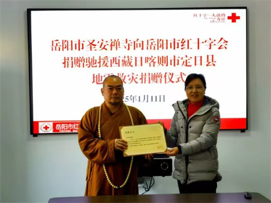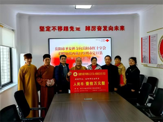 中國新報訊(記者陳海波 張偉 特約記者 付世榮)1月11日上午9時,岳陽圣安寺的僧人與信眾來到了岳陽市紅十字會,在岳陽市紅十字會黨組書記、常務(wù)副會長劉玲等有關(guān)負責人熱情接待下,圣安寺代表廣大信眾為西藏日喀則定日縣地震災害捐出善款十萬元現(xiàn)金。